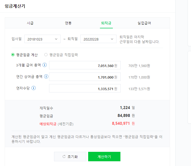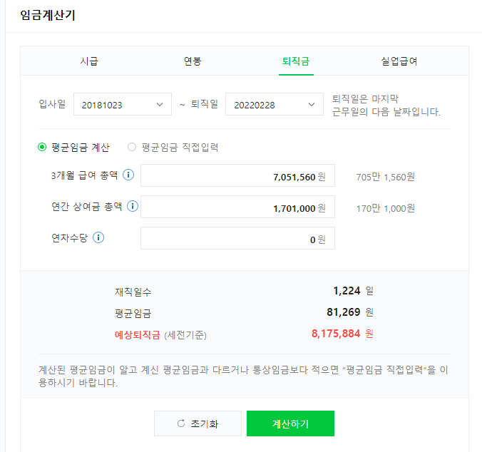 네이버 퇴직금 계산기로 연차수당0원으로 할 시 퇴직금은 밑에 사진과 같고 연차수당에 계산한 연차수당을 넣으면 두번째 사진과 같습니다.