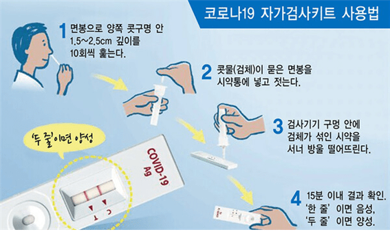 신속항원검사는 자가진단키트를 활용하여 시행하며 아래의 방법에 따라 진행됩니다.