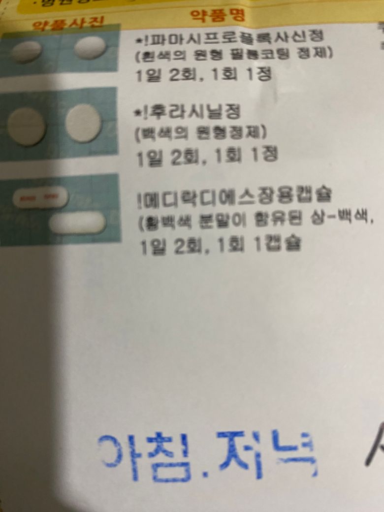 10일차부터 항생제를 바꾸어서, 파마시프로플록사신정,후라시닐정,정장제와 디스크처방약(소염진통제,리가린,라베미니정)을 함께 먹었어요.