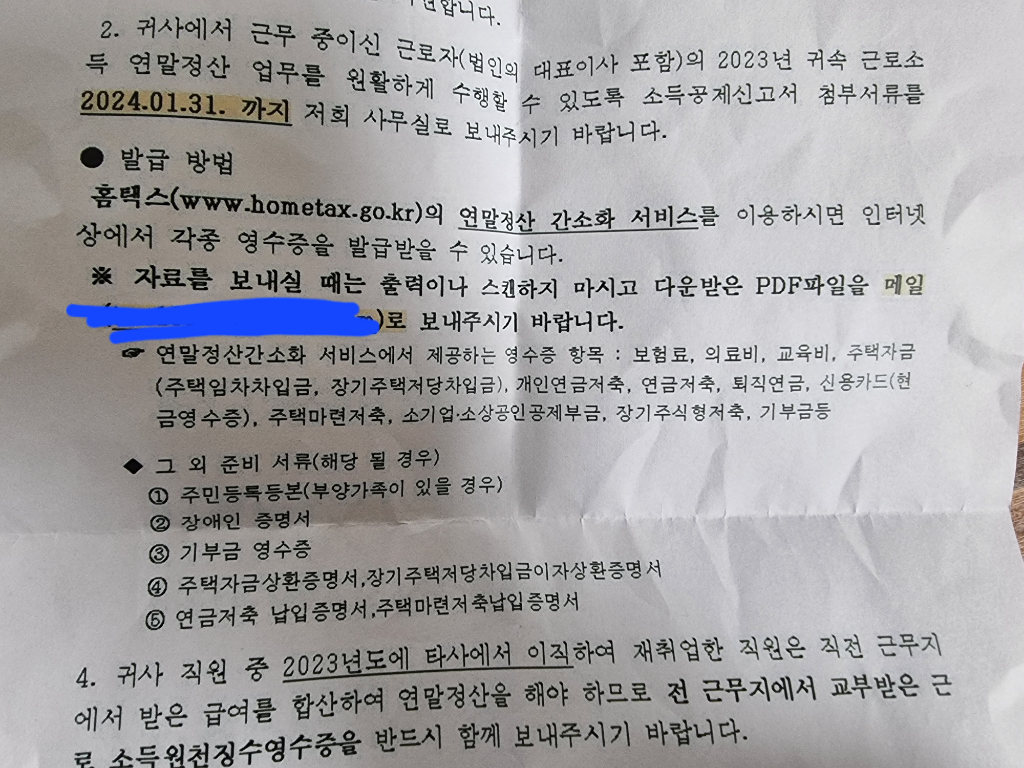 전 직장에서는 아마 연말정산 간소화 자료 일괄제공 서비스를 적용하여 회사가 근로자의 동의를 받아 국세청에서 직접 공제자료를 받는 시스템이셨던 것 같습니다.