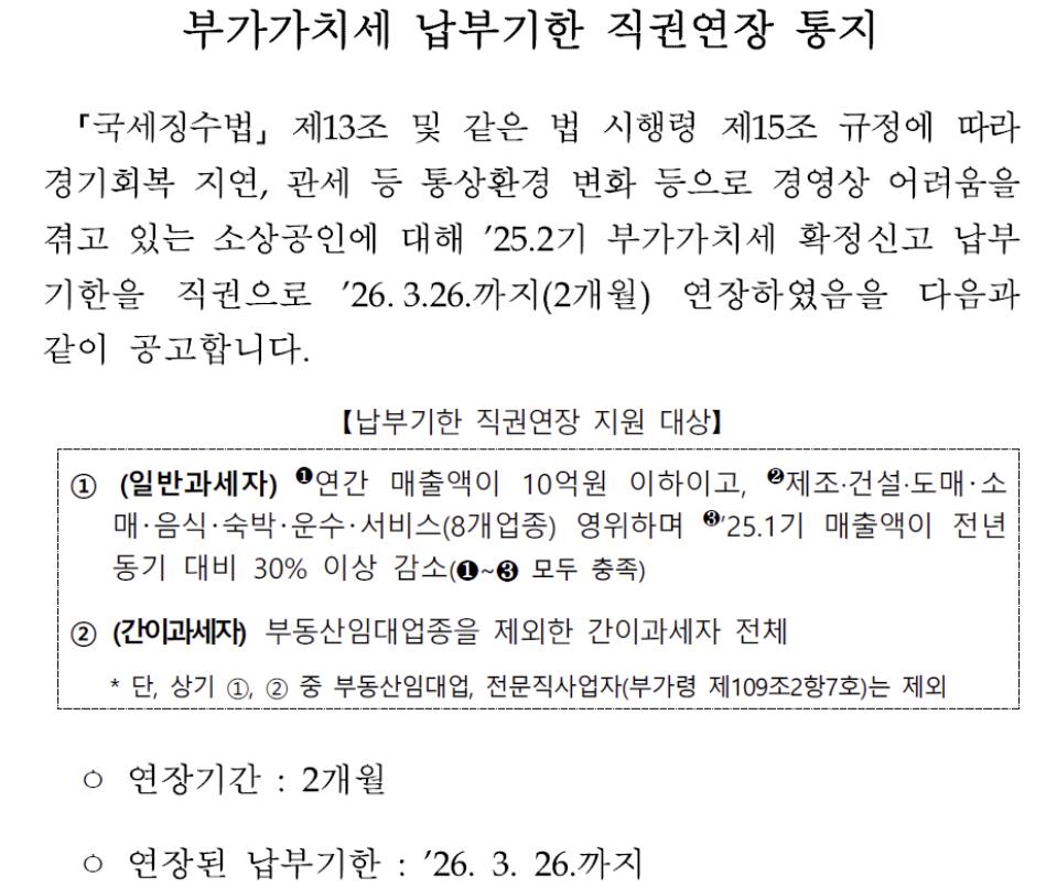 2025년 2기 확정 부가가치세 신고납부기한은 2026년 1월 26일까지이나, 경영상 어려움을 겪고 있는 소상공인에 대해 납부기한만 2개월 연장하여 2026년 3월 26일까지 납부기한이 직권 연장되었습니다.