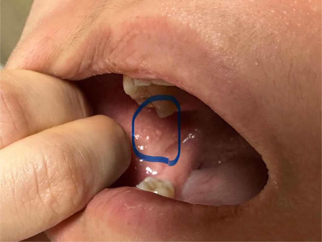 올려주신 사진에선 병변이 또렷히 보이지 않으나 해당 부위는 볼 안쪽 점막으로 편도가 아니므로 편도결석의 가능성은 배저할 수 있겠습니다.