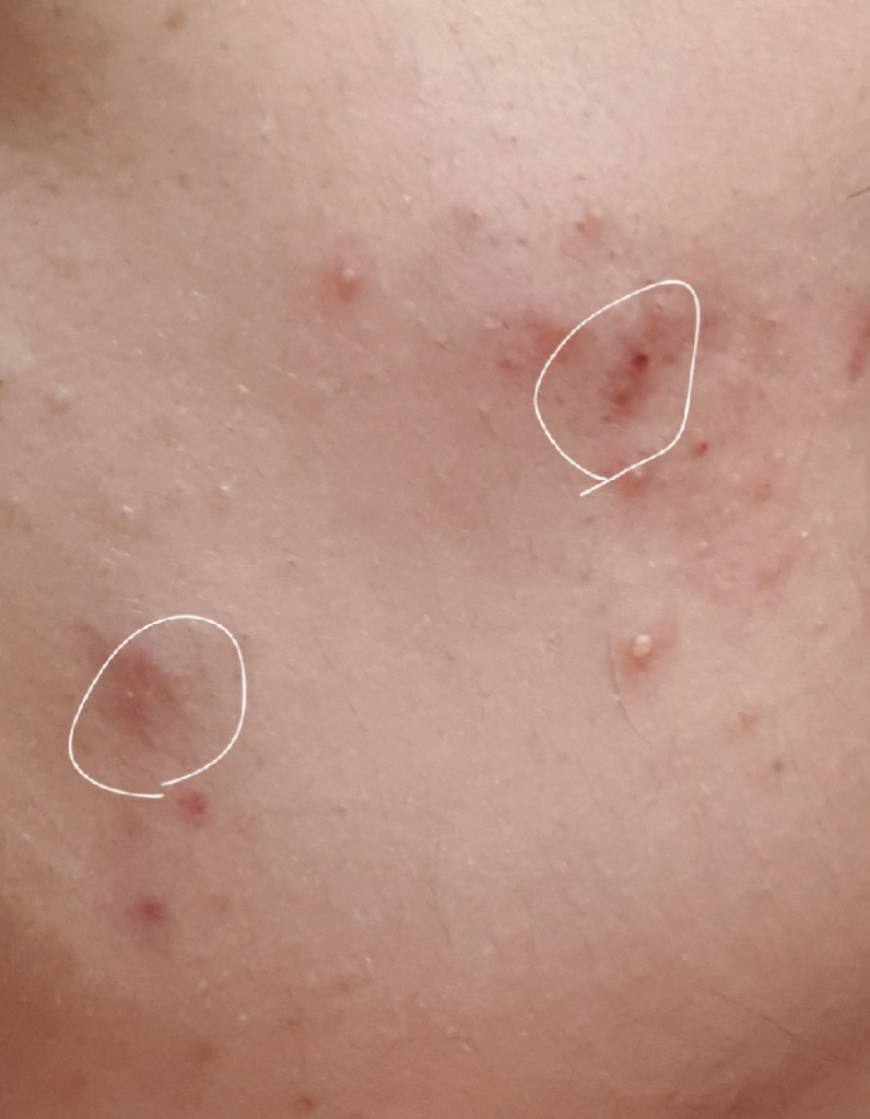 오른쪽 볼에 사진처럼 트러블이 올라왔는데 여드름인지 모낭염인지 구분이 어렵네요 병원갔을 때는 여드름이라고 미노씬 처방해주셨는데 여드름에 대해서 설명을 안 해주시길래 질문 해봅니다. 사진처럼 크기는 작고 만졌을 때 느낌은 오돌토돌한 느낌입니다. 동그라미 친 부분은 색이 약간 검게됐고 짜지진 않는 것 같고 만지면 약간 불룩 튀어나온느낌이 납니다 그런데 겉으로 모기에는 튀어나온거같진 않아요.. 어떻게 된건가요? 그리고 미노씬 먹으면서 에스로반 같이 바르려하는데 만약 저게 여드름이라도 에스로반 연고 발라도 되나요?