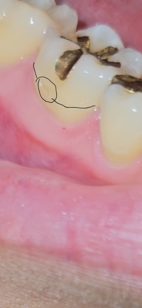 사진으로는 정확하게 보이진 않지만 해당 부위는 딱딱한 음식이나 과도한 칫솔질로 인해서 마모나 파절이 되었을 가능성이 있습니다.