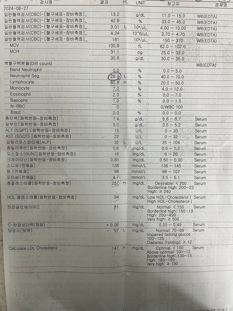 콜레스테롤은 좋아졌는데 백혈구랑 호중구는 좀 더 낮아진 것 같아요 백혈구가 3000정도고 그 중 호중구가 60-70이 정상인데 호중구가 29.8% 나왔습니다ㅠㅠ