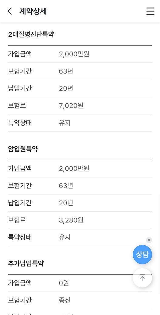 - 3대질병의 보장금액은 만족하나, 현재 판매되는 보장범위보다는 좁은 진단비로만 구성된점은 아쉽습니다.