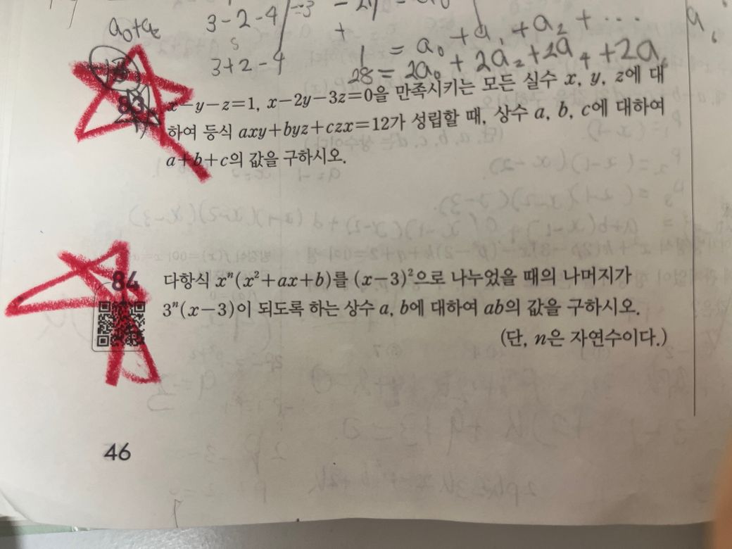 안녕하세요. 고1 수학 항등식과 나머지 정리 문제는 원리만 알면 간단합니다. 83번은 문자를 하나로 줄이는 것이 핵심입니다. 주어진 식들을 연립하여 y = 3z-1, x = 5z-1로 정리한 뒤 메인 식에 대입하세요. z에 대한 항등식이 되므로 각 항의 계수가 0이 되어야 합니다. 이를 풀면 a=1, b=4, c=-1이 나와 a+b+c=4가 됩니다. 84번은 나머지 정리 식을 쓴 뒤 x=3을 대입해 9+3a+b=0을 얻는 것부터 시작합니다. b를 a에 대한 식으로 바꿔 원래 식에 대입한 후 x-3으로 양변을 나누면 a=-6, b=9가 나옵니다. 따라서 ab의 값은 -54입니다. 차근차근 대입해보면 충분히 풀 수 있습니다.