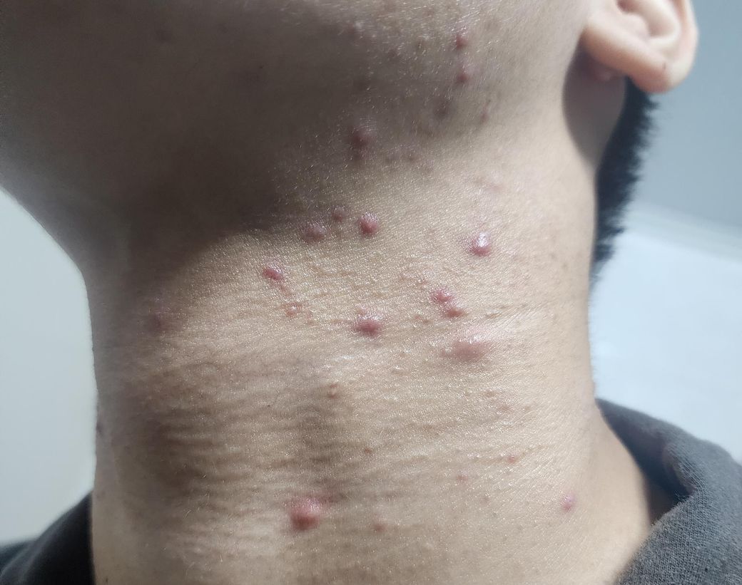사진상 병변은 단순 면포성 여드름보다는 염증성 구진·농포가 다수 보이며, 분포가 목 부위에 집중된 점을 고려하면 모낭염(특히 세균성 또는 면도 관련 자극) 가능성이 높습니다. 일부는 결절 형태로 진행하는 초기 단계로 보입니다.