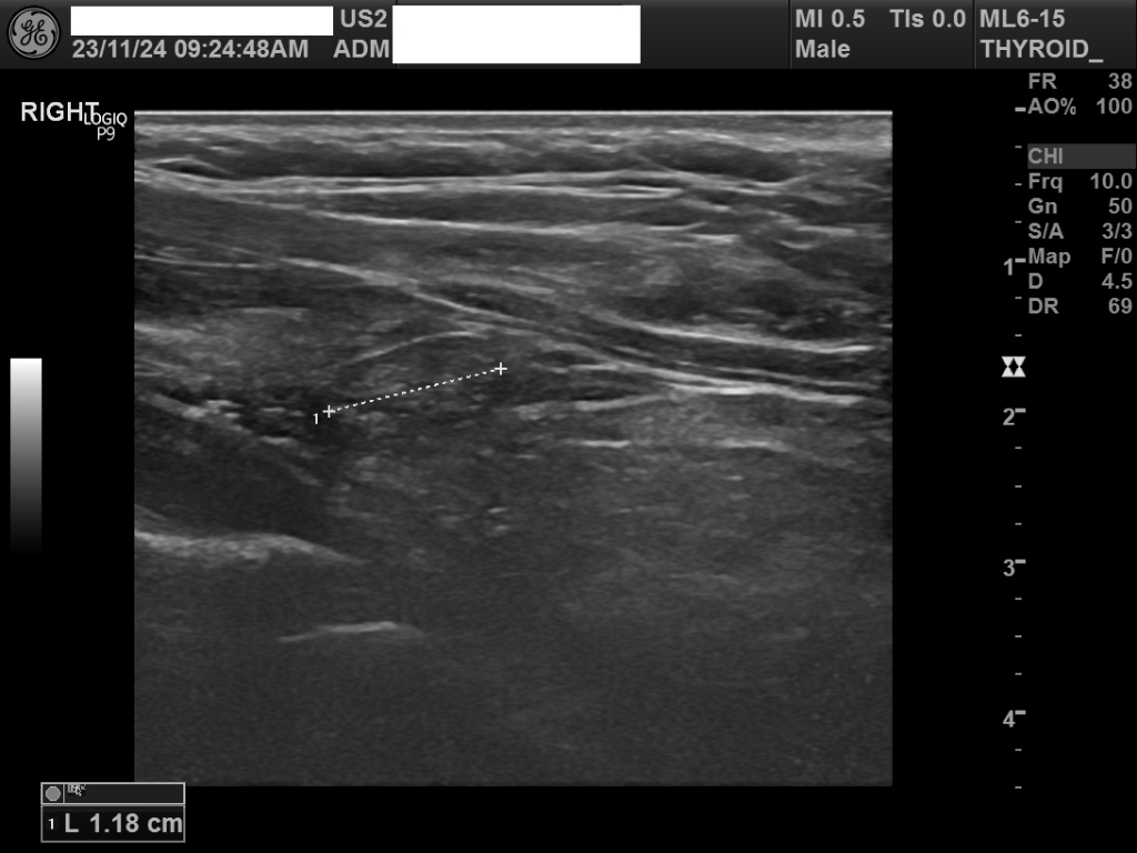 1.18cm 크기의 결절은 상대적으로 크기가 큰편은 아닙니다. 갑상선 결절의 암 여부를 결정하는 것은 크기만으로는 불가능하며, 초음파의 세부적인 소견, 환자의 개인적인 위험 요인, 그리고 필요한 경우 세침 흡인 생검(FNA) 등 추가 검사를 통해 평가됩니다.