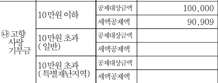 지방소득세까지 포함하여 10만원 전액이 공제되는 것이기에 근로소득원천징수영수증 상 공제금액은 90,909원이 찍히고, 나머지 9,091원은 지방소득세에서 환급이 됩니다.