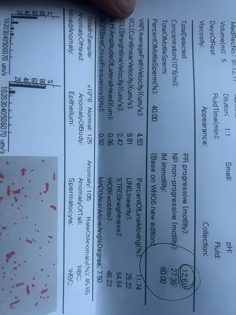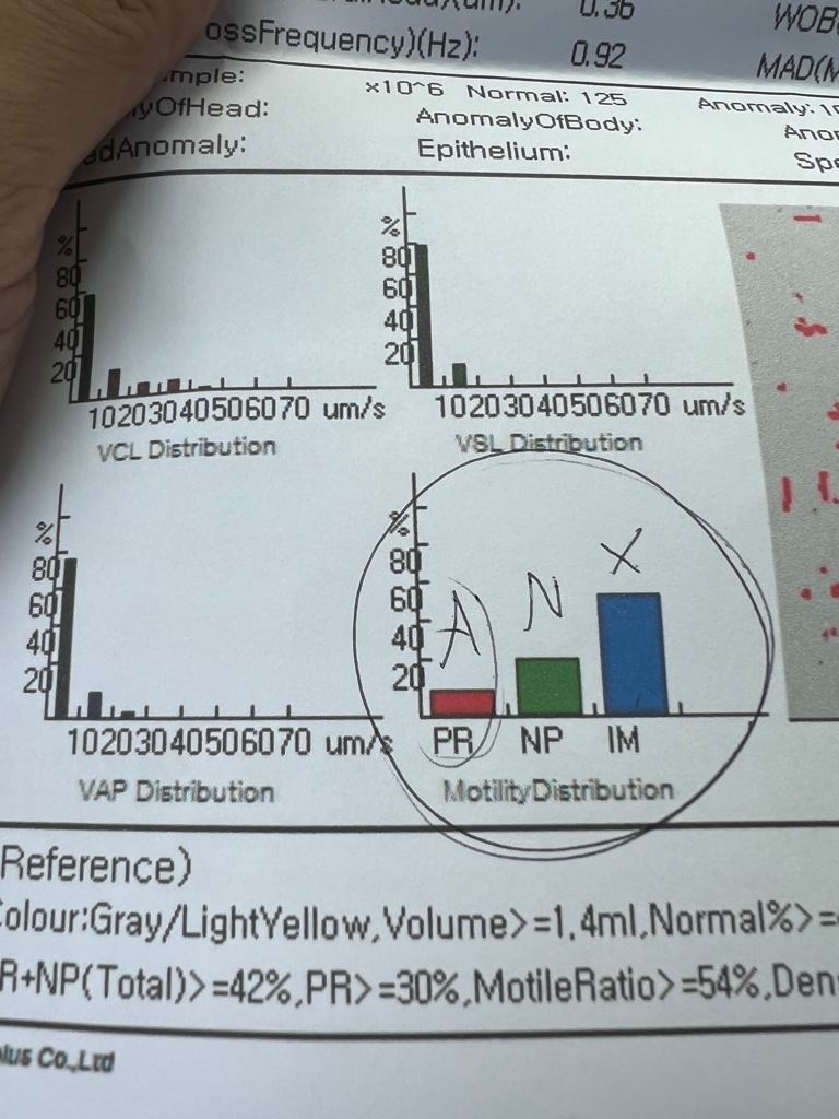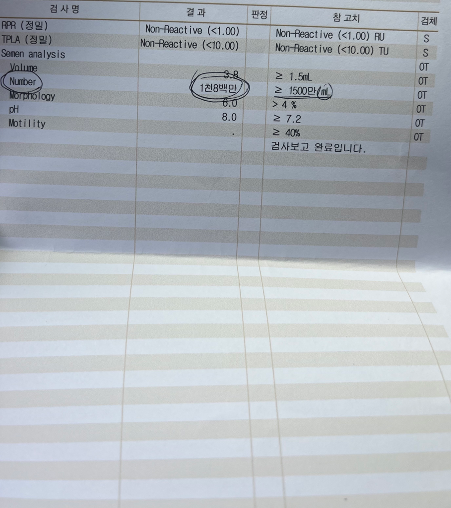 우선, 검사 결과입니다. 정액 내 총 정자수는 3천9백만 이상이 정상인데, 검사 결과는 1800만입니다. 정자운동성은 42% 이상이 정상인데, 결과 40%이고, 직진 운동성은 20% 이상이 정상인데, 12.61%로 부족합니다.