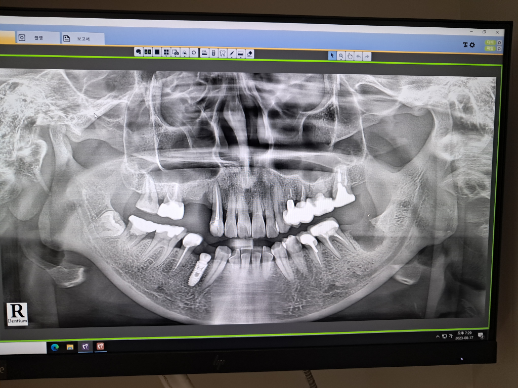 오른쪽 위 치아의 경우 이제 작은 어금니(4번, 5번)가 2개 다 빠졌고 해당 자리에 2개의 임플란트 식립이 필요합니다. 공간이 타이트하긴 하지만 한개만 심기에는 임플란트 크라운(머리)이 너무 커지고 하중도 많이 가해질 것 같아서 좋지 않습니다. 일단, 2개의 임플란트를 심는다치면 상악동 거상술과 골이식술은 각각 진행되는 것이 아니고 같이 진행됩니다. 상악동 거상술은 위턱의 양쪽에 있는 크기가 큰 공기 주머니의 아래부위 막을 들어올리는 수술입니다. 이걸 하지 않고 그냥 임플란트를 심게 되면 임플란트가 고정이 잘 안될 수도 있고 상악동에 의도치 않게 구멍이 뚫려 버릴 수도 있습니다. 상악동 거상술을 하고 리프팅 하여 생긴 사이 공간에 인공뼈를 넣어둡니다. 그렇게 하여 임플란트 뿌리(픽스처)가 심어질 깊이를 좀 더 확보하는 것입니다. 다만, 이건 정확히 길이를 측정해봐야 알겠지만 짧은 길이의 픽스처를 심는다면 많은 양의 인공뼈는 넣지 않아도 될 것 같습니다.