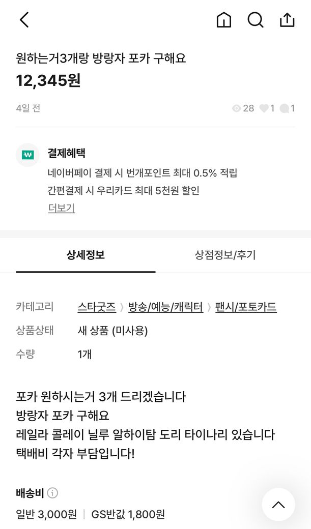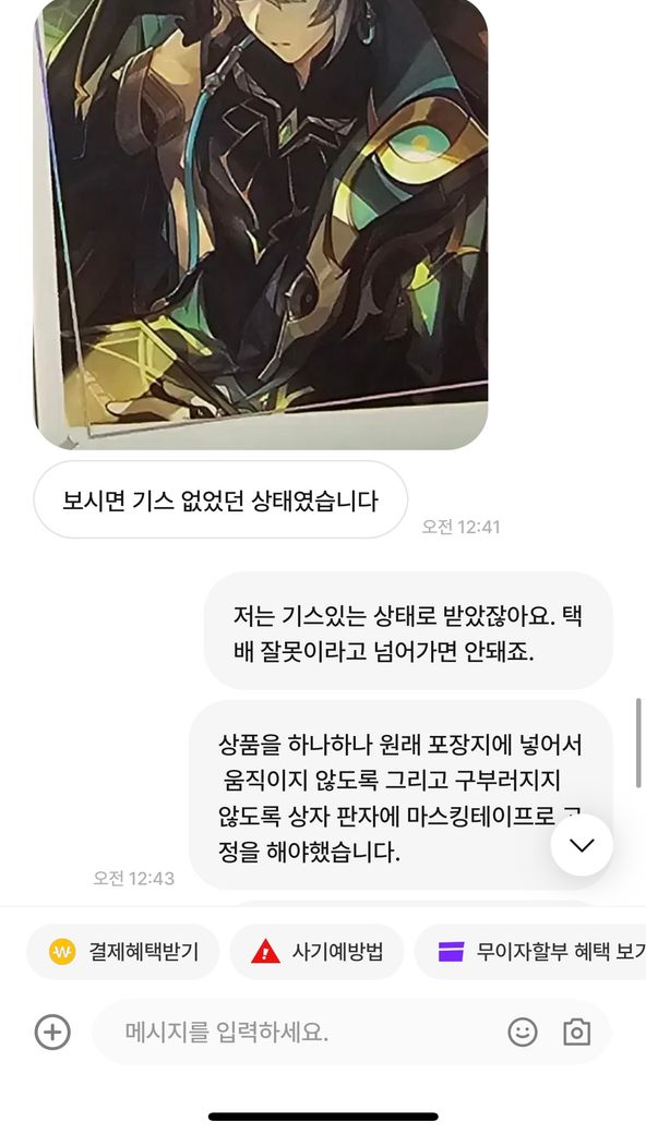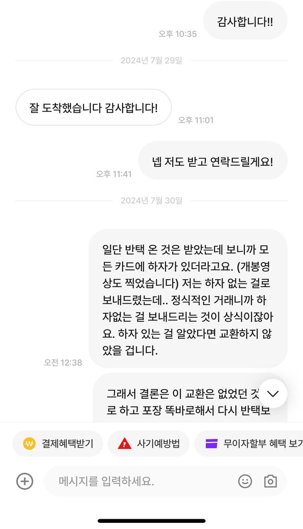 안녕하세요. 7월 25일 오전 9시쯤에 중고플랫폼인 '번개장터'에서 메가커피X원신 콜라보 MD상품 구매 특전인 홀로그램 생일 포토카드를 교환하였습니다. 특전은 13종 랜덤이였고 제가 갖고 있던 특전이 이번 콜라보 주인공이였기에 시세가 3만원 정도였고 거래자분도 그걸 알았기에 제가 갖고 있는 것 1개와 자신이 갖고 있는 다른 캐릭터 특전 3개를 교환하자고 한 것입니다. gs반값택배를 통해 교환은 순조롭게 진행되었고 7월 30일 오전 12시쯤에 편의점에 가서 교환물품을 가져왔는데 포장이 부실하게 된 것 같아서 혹시 몰라 개봉영상을 찍었는데 아니나다를까 3개 특전모두 하자가 있더라고요. 포토카드는 하자가 있으면 곧바로 값어치가 확 떨어져서 저도 이를 유의해 하자없는 걸로 보냈거든요. 그리고 특전은 원래 은색비닐포장지에 특전 포토카드 한 개가 들어있는데 거래자분이 그 포장지 하나에 특전 포토카드 3개 모두를 집어넣으셨더라고요. 포장지가 3개가 와야되는데 한 개만 왔습니다. 포장지도 그 물품의 값어치에 포함되거든요. 그리고 하나의 포토카드가 들어가는 것에 3개를 넣으셨으니 거기에서 포토카드에 하자가 생긴 건 아닐지 생각됩니다. 그래서 제가 거래자분께 하자있으니 다시 재교환했으면 좋겠다고 문자를 드렸는데 거래자분은 자기가 포장할때는 하자 없었다면서 택배사 잘못이니 교환 못해준다고 해서 이렇게 문의를 하게 되었습니다. 민사소송이나 나홀로 소송을 통해 재교환할 수 있을까요? 소송비용은 얼마일까요? 만약 물품가격보다 소송비용이 더 크면 소송을 진행하지 못할 것 같습니다. 그리고 택배사에 요청하면 보상해줄까요? 보니까 반값택배는 배송 중 발생한 하자는 책임지지 않는다고 하더라고요.