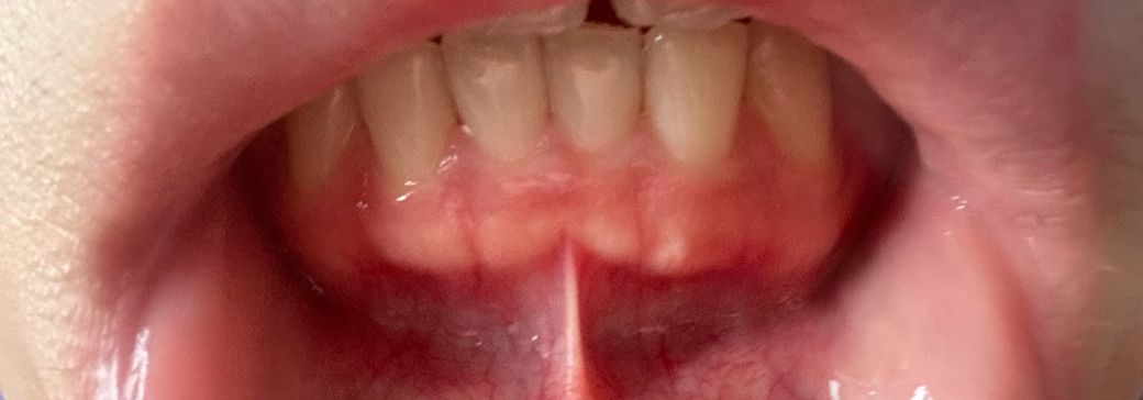 정상적인 잇몸 색입니다. 앞니 부위는 다른 부위보다 뼈가 얇아서 입술을 당기면 치조골(뼈) 주위에 있는 잇몸이 당겨지면서 치조골이 일부 비춰보이는 것은 매우 흔합니다. 또한 앞니 부위는 잇몸도 상대적으로 얇기 떄문에 대부분 사람이 지금과 같이 입술을 당기면 안쪽 뼈가 보여 하얗게 보입니다.