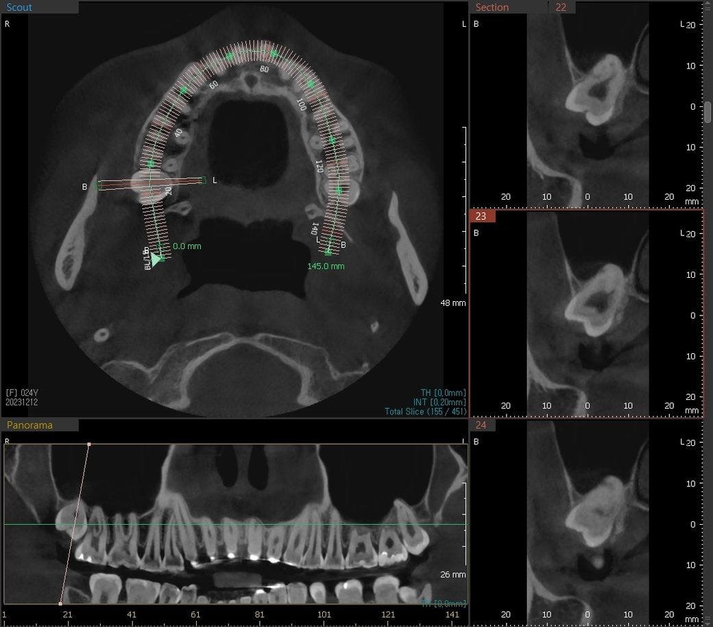파노 상으로는 가까워 보이지만 CT상으로 보면 사랑니와 신경관과의 거리가 잇어 보입니다. 크게 걱정은 하지 않으셔도 될것같습니다. 단, 대학병원에서 발치를 하시는게 좋을것같습니다.