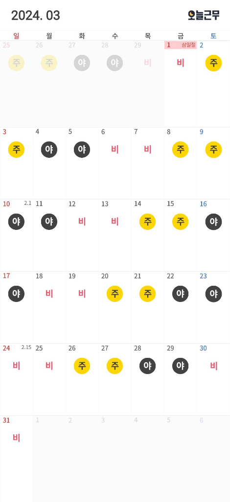한달은 스케줄표사진 처럼 주간.야간 을 번갈아하는 격달 근무패턴 입니다