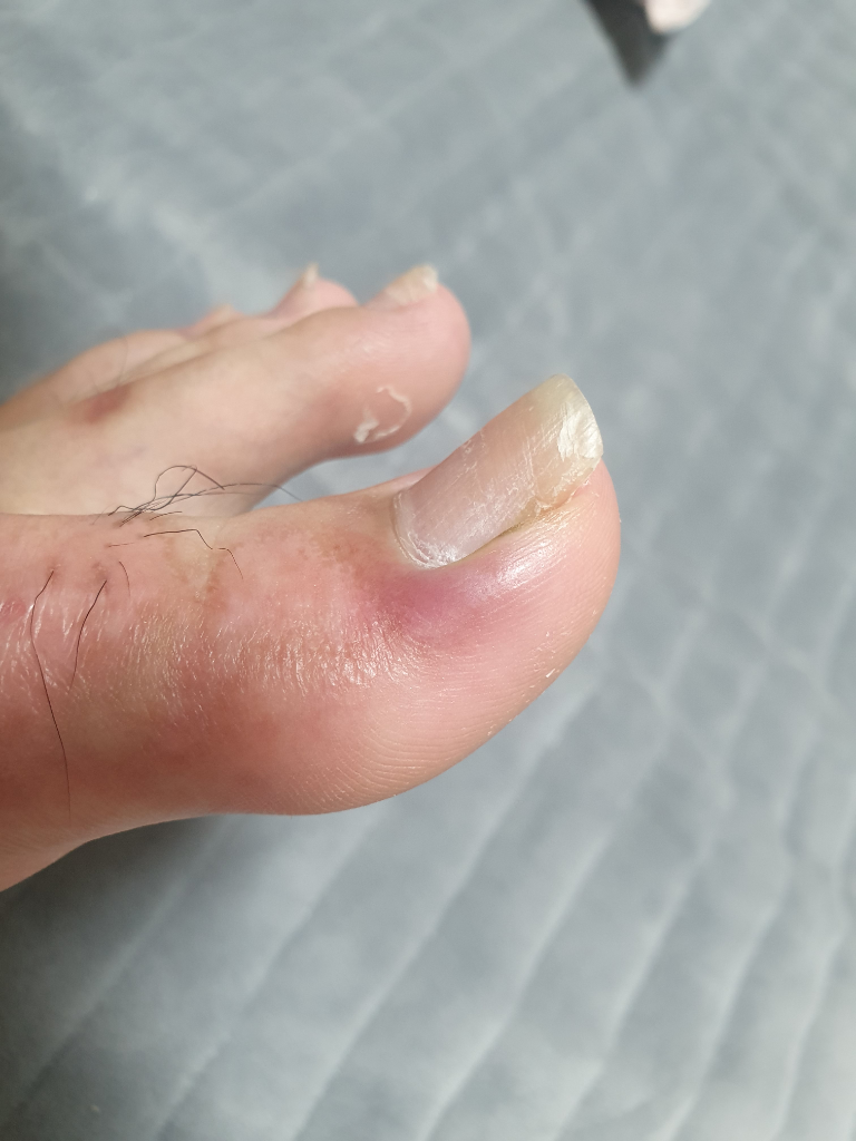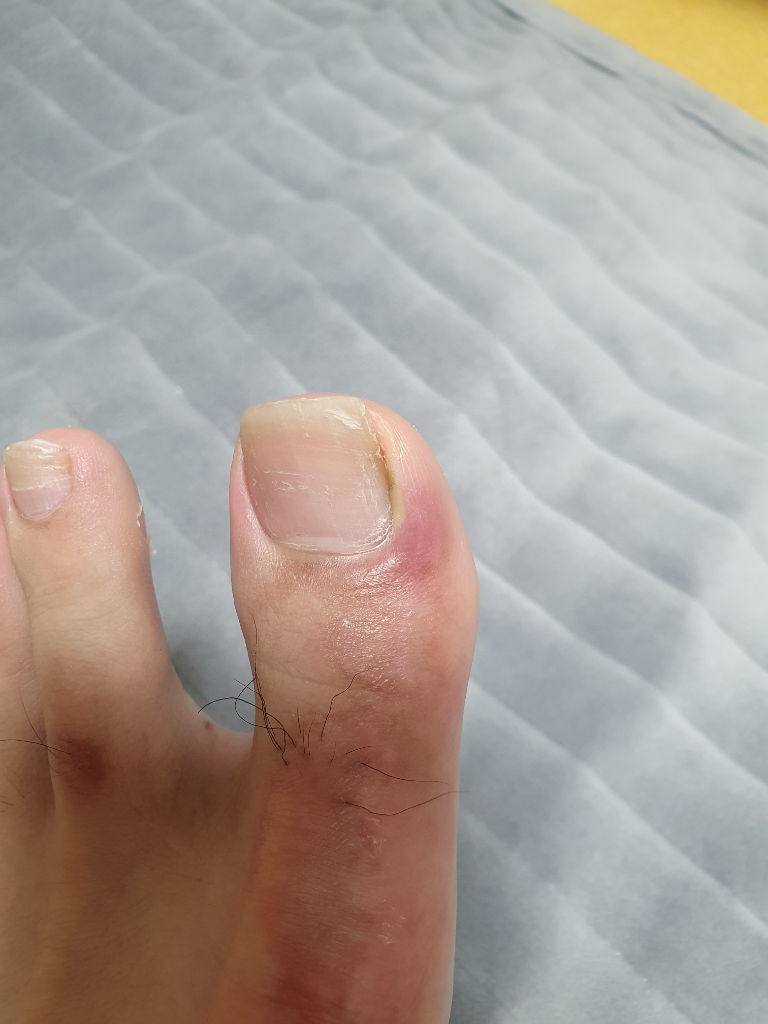 현재 발톱 주위로 발적 및 부종이 관찰되고 있어 내성발톱으로 인한 연조직 감염의 가능성이 있습니다.