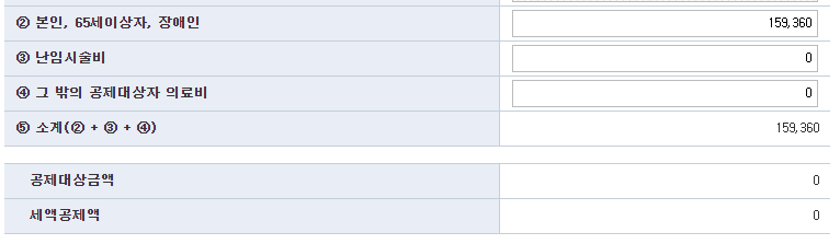 2. 의료비 공제대상입니다. 총급여 3% 미만 의료비가 지출되어 공제대상금액이 0으로 표시된 것으로 보입니다. 의료비 159,360원일 때 총급여가 5,312,000 이상이라면 의료비 공제받을 수 없습니다.