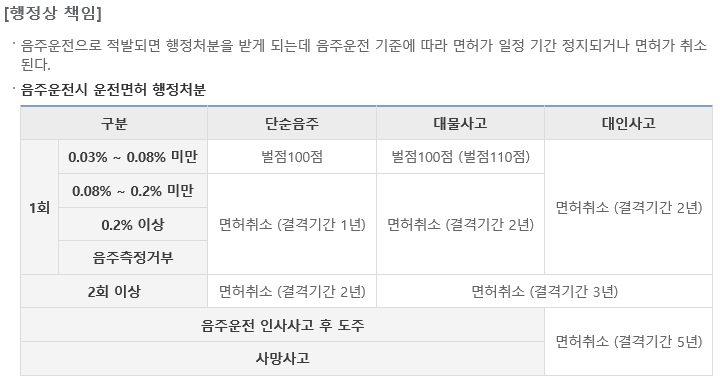 질문하신 내용에 대하여 아래와 같이 답변 드립니다.음주운전과 관련하여 행정삼 책임이 문제되고, 특히 다시 면허를 취득하기 위한 결격기간이 다양하게 구분되어 있습니다.