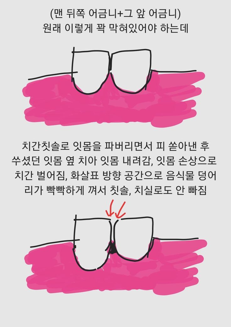 맨 뒤쪽 어금니랑 앞 어금니 사이 치간유두부가, 치간칫솔로 인해 길다랗게 터널? 구멍이 뚫림