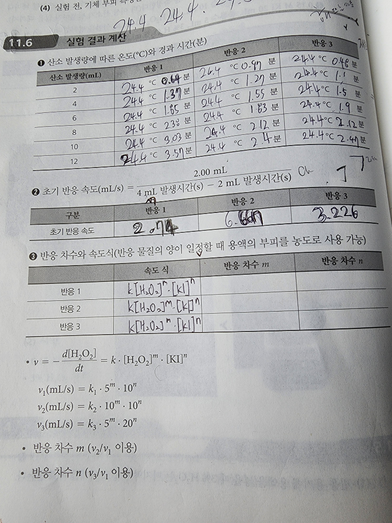 위 실험데이터를 기반으로 v1=k1 5^m 10^n 인데, 반응 1의 농도 m, n을 설정하여 첨가하셨을 것으로 판단됩니다. 산소 발생량에 따라 속도가 다 다른데, 이 때 반응1, 2의 비율을 통해, 예를 들어 0.64:0.97의 비례식을 통해, k1, k2의 비율을 구할 수 있습니다. 왜냐하면 산소 발생량이 2~4일 때 v1=k1 5^m 10^n, v2=k2 10^m 10^n에서 m, n은 기입이 가능하고 k1, k2는 모르고 v1, v2의 비율은 알 수 있기 때문이죠. 산소 발생량이 4~6일 때도 비율을 이용해서 구하시면 될 듯합니다. k1, k2, k3를 비율로 구하고, m, n의 대입을 통해 속도를 구함으로써 k1, k2, k3를 정할 수 있습니다.