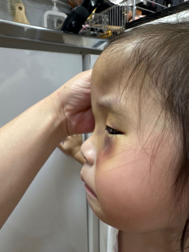수영장에서 놀다가 벽같은데 부디쳤는데 그뒤로 혹이 생기고 멍들다가 눈밑까지 멍이퍼져있습니다