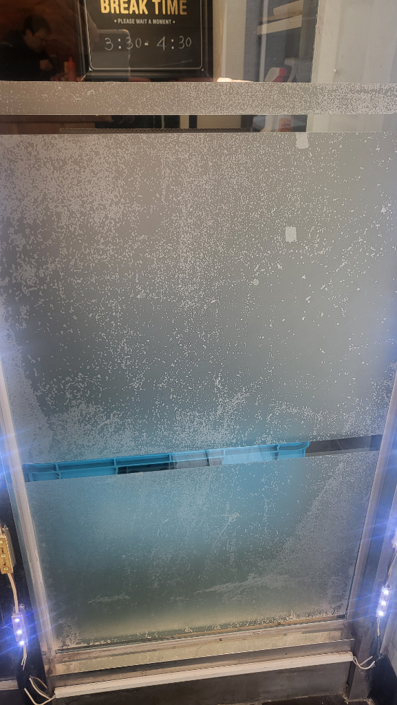 무점착 반투명시트지를 기포없이 바른다고 바랐는데 마르고나니 사진처럼 되었어요. 아래사진이시트지 붙여진 면인데 많이 지저분하네요. 유리에 퐁퐁물 뿌려서 붙였습니다. 무엇이 문제인지요?