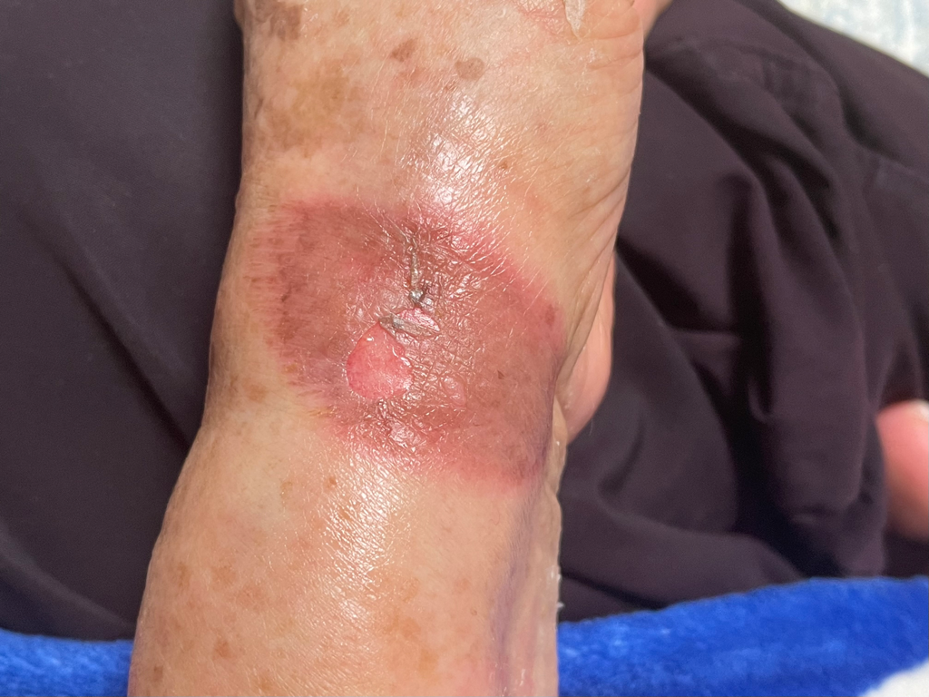 사진으로 보이는 부위는 화상에 의한 손상을 보이고 있으며, 적절한 치료 절차를 밟고 계신 것 같습니다. 화상 치료는 개인의 건강 상태, 손상 정도, 화상의 위치와 깊이에 따라 치유 속도가 달라질 수 있습니다. 일반적으로 연세가 많으신 분들은 피부 재생 속도가 젊은 사람에 비해 느릴 수 있습니다.