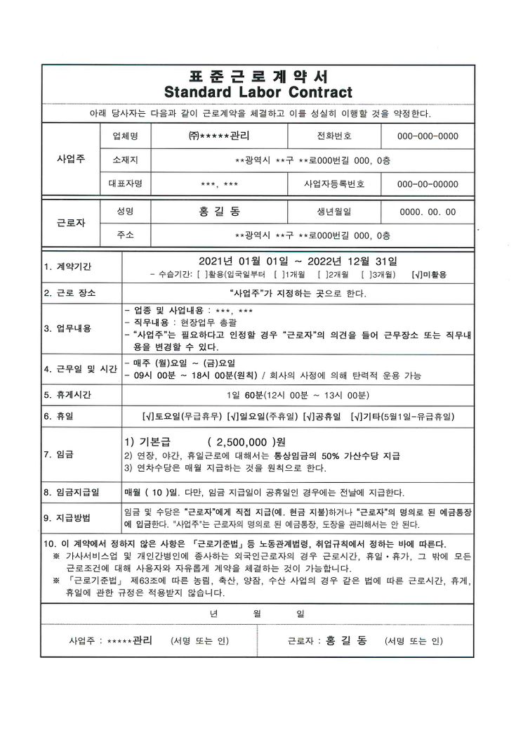 사례의 경우 연장, 야간, 휴일근로수당에 대해서 근로계약서대로 명시해도 되고 삭제해도 무방합니다.
