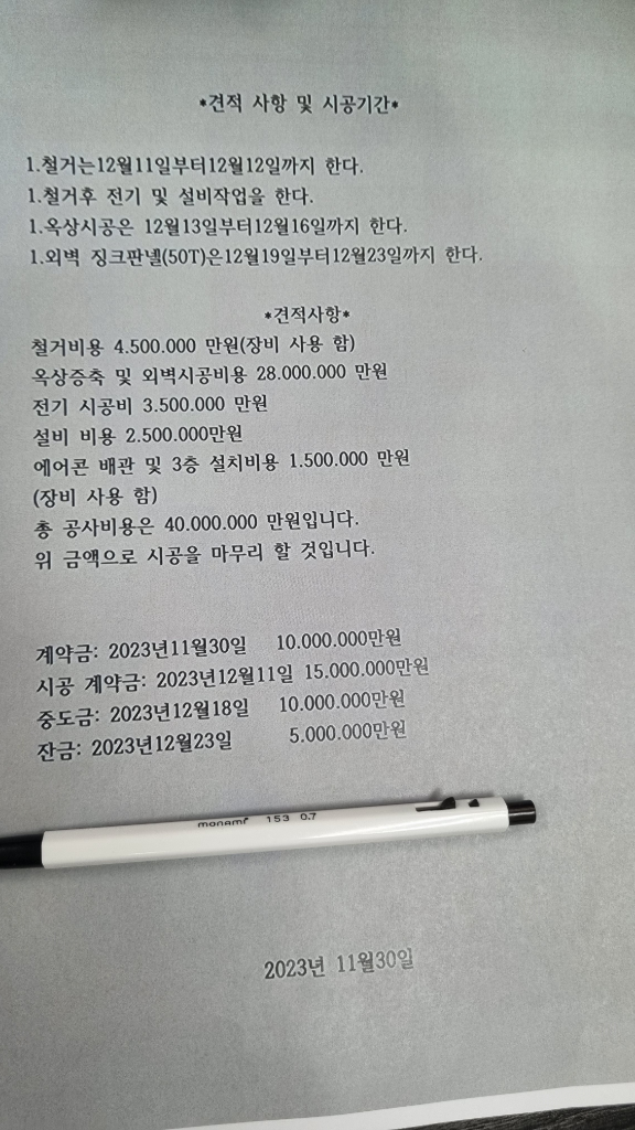 초기 공사비용 4천만원 중 3천5백 지급 완료, 5백만원 잔금 남음(계약서 작성완료)
