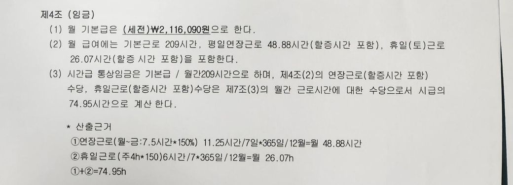 기본급에 연장근로 휴일근로 금액을 더한다는 내용은 이해했으나 저 소수점 자리의 시간이 법적으로 맞는부분인지 잘 모르겠고 산출근거 공식을 복잡하게 나열했는데 좀 풀어서 설명해주셨으면 합니다 근로자한테 불리한건지 아닌지 개인적인 의견도 듣고싶습니다
