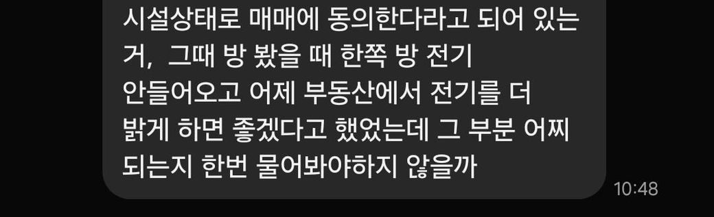 방 하나에 전기가 안 들어오는 상태는 단순 전등 불량인지 배선·차단기 등 구조적 하자인지에 따라 책임 범위가 달라지므로 현 상태 매수로 진행하면 분쟁 소지가 커 매도인에게 원인 확인 및 수리 완료 후 매수하거나, 최소한 ‘전등 자체 불량으로 확인되어 교체 완료 또는 인도 전 수리’라는 내용을 특약에 명시하는 것이 안전하며, 기존 특약 중 ‘현 상태 매수·하자 책임 면제’ 취지 문구가 있다면 전기 하자까지 포괄할 수 있어 매수인에게 불리할 수 있으니 전기·설비·누수는 인도 전까지 매도인 책임으로 보수한다는 특약을 추가하는 것이 실무적으로 권장됩니다.