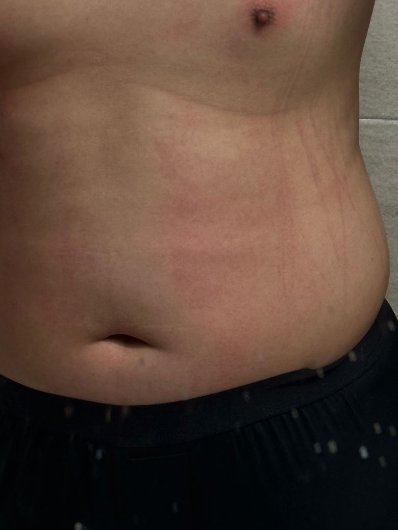 안녕하세요. 이게 뭔가 혹처럼 동그랗고 딱딱하게 올라온건 아닌데 일자로 쭉 올라와있어요. 근데 뭔가 만져집니다. 누르거나 만져도 아픈 느낌은 없고 누르면 폭 들어갑니다. 사진상으로 배꼽 반뼘 위 오른쪽입니다. 빨간건 긁어서 그렇습니다.