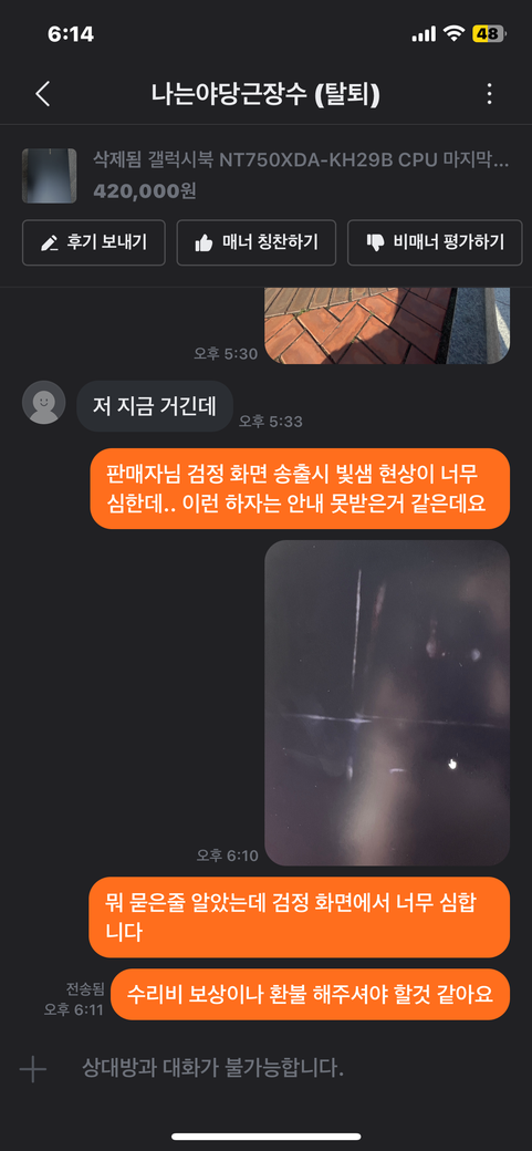 오늘 새벽 연락 오늘 오후 5시 30분경 삼성 노트북 직거래했습니다. 사전에 채팅할때 하자 없다고 했고 믿고 구매하였는데 집와서 확인해보니 빛샘 현상이 너무 심하게 발생해서 환불 요청 했더니 읽지도 않고 계정 삭제하고 튀었습니다 112에 전화해보니까 사기가 아니라 민사다 머라머라 하는데 잘모르겠어요