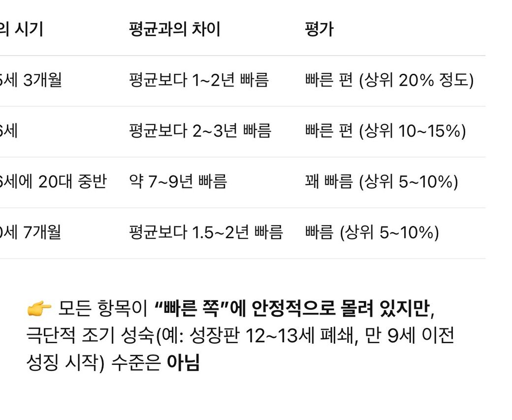 지금은 신체 성숙도가 상위 10-15% 수준임..