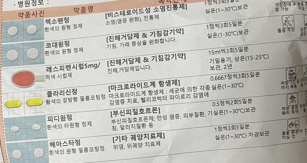 피디원정은 메틸프레드니솔론 4 mg을 주성분으로 하며 소염 효과가 강하기 때문에 소염진통제와 함께 처방되는 경우가 있습니다. 진해거담제와 같이 처방된 것으로 보아 인후염을 빠르게 가라앉히기 위해 처방된 것으로 생각됩니다.