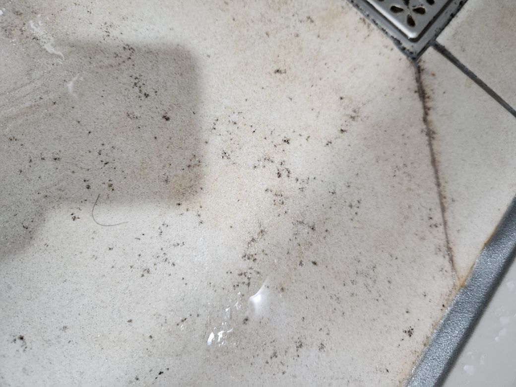 위의 사진과 같이 염색약이 바닥에 물들었습니다. 락스를 비롯한 욕실 청소제품을 뿌리고 청소 솔로 문질러도 잘 지워지지 않네요.