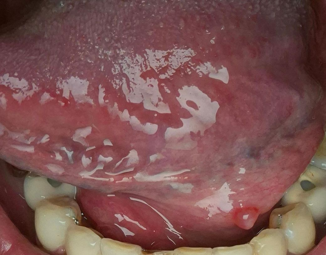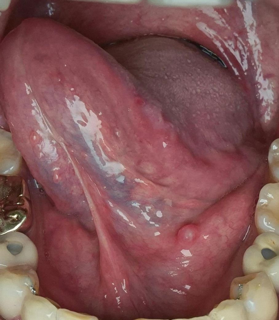 사진상 설하부(혀 밑) 점막에 2–3 mm 정도의 둥근 융기 병변이 보이며, 표면은 비교적 매끈하고 반투명 또는 약간 창백한 색조로 관찰됩니다. 통증이 없고 이물감만 있는 점을 고려하면 다음 가능성이 우선입니다.