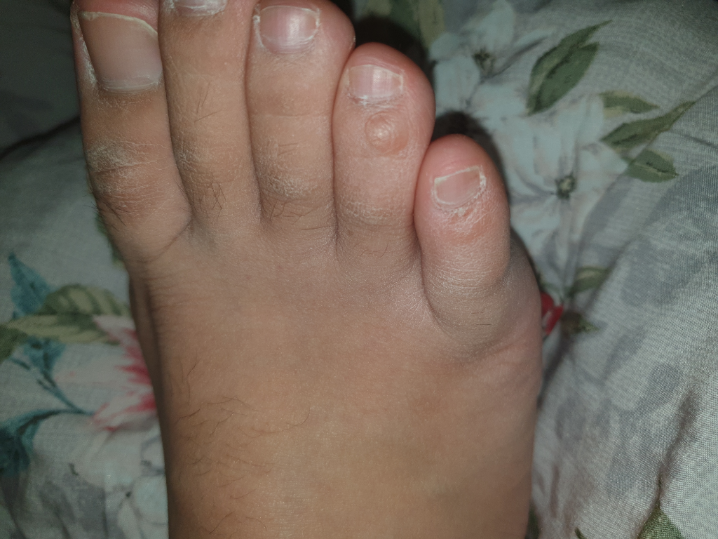 우선 물집성 병변으로 보여집니다. 외부 충격등이 없으셨다면 물집이외에도 사마귀 등의 가능성 까지 있기 때문에 사마귀 치료를 받으시는 병원에서 진료를 보실때 함께 진료를 받아보시는 것이 좋겠습니다.