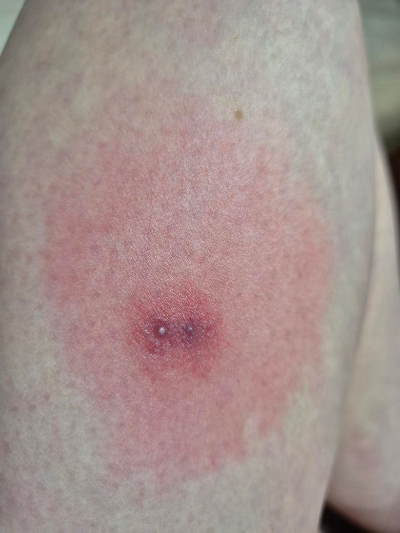 물린 곳의 피부병변을 보고는 벌레나 진드기를 유추하기는 어렵습니다. 다만 주변 발적 양상이 있고, 고름도 잡히는 양상이 있어서 연조직염 에 준해 항생제 및 현재 염증 수치 확인 위한 혈액검사 필요하다고 생각됩니다.