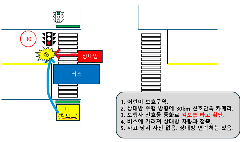 상대 차량이 우회전을 하는 차량이였다면 버스 때문에 가려져 있어서 사고가 날 수도 있는 상황이나 상대방이 그냥 신호 위반을 하여서 사고가 난 것이고 질문자님 입장에서는 신호를 위반하여 진행하는 차량까지 확인할 수는 없었던 사고라고 주장을 하시기 바라며 공유 킥보드의 경우 도로교통법상 차에 해당하기 때문에 횡단보도 보행자 보호 의무 위반은 적용이 되지 않는 사항이며 상대방의 신호 위반만 적용이 됩니다.