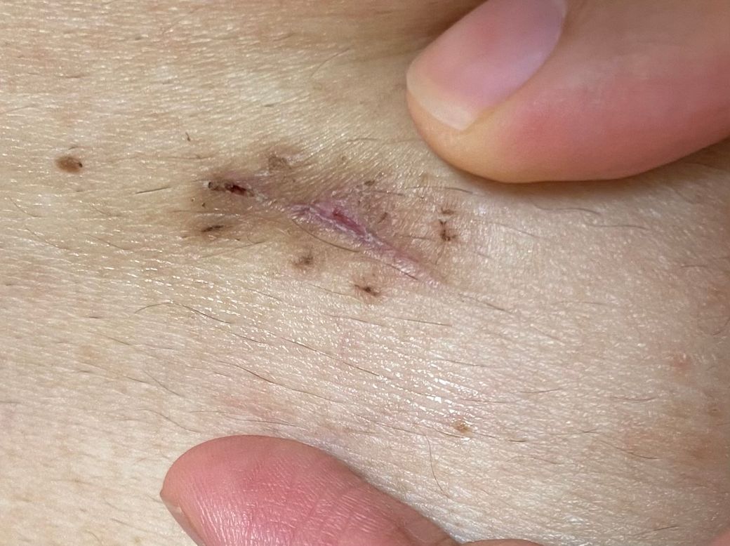딱지 떨어질때까지 마데카솔 발라주었는데 가운데부분에서 하얀? 짓물이 아주 조금씩 나오고 물닿으면 따가워요