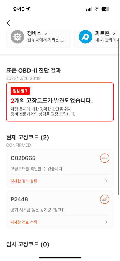 차량에 경고등은 들어오지 않았는데요 인포카로 스캔해보니 고장코드 두개가 나와있네여