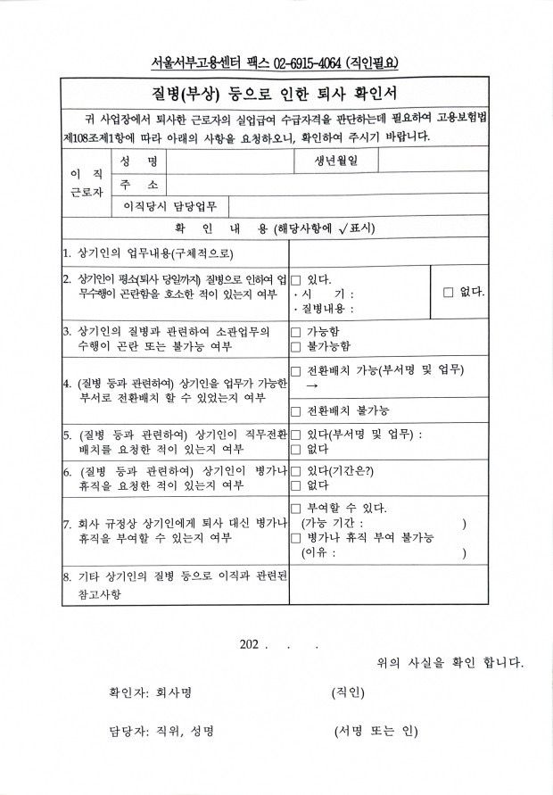 질병으로 인한 퇴사 시 사업주확인서를 받아야 하며, 휴직이나 업무전환이 불가해야 자발적으로 퇴사하더라도 실업급여 대상이 됩니다.