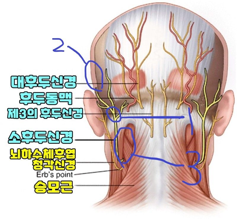 3번은 저기 소후두신경? 저부분인지 저기보다 조금 안쪽인지 누르면 뻐근한 통증이 있습니다.