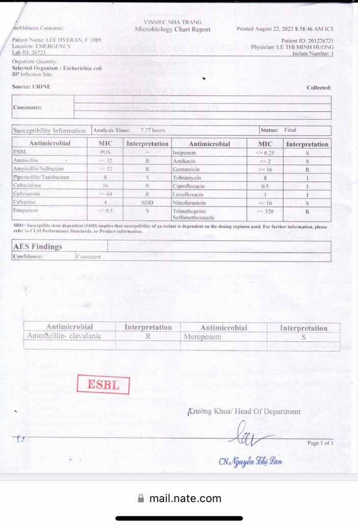 Esbl양성이라서 바난은 효과가 없습니다. 크라비트도 중간정도의 내성이라서 효과가 없을 수도 있는데 다행히 한국 검사는 안 자랐나봅니다. 제 생각에는 cipro 항생제로 바꿔서 드셔보시거나 입원해서 주사로 항생제를 써야될것 같습니다.