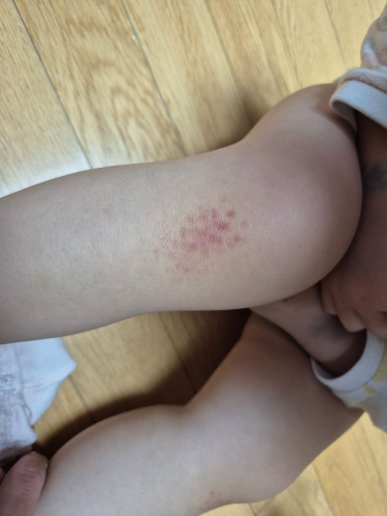 오늘 저녁에 옷 갈아입히는 중에 봤는데요. 아이가 아파하거나 그러진 않은데 아침에는 없던 자국이 무릎에 생겼더라구요. 괜찮은지 궁금합니다.