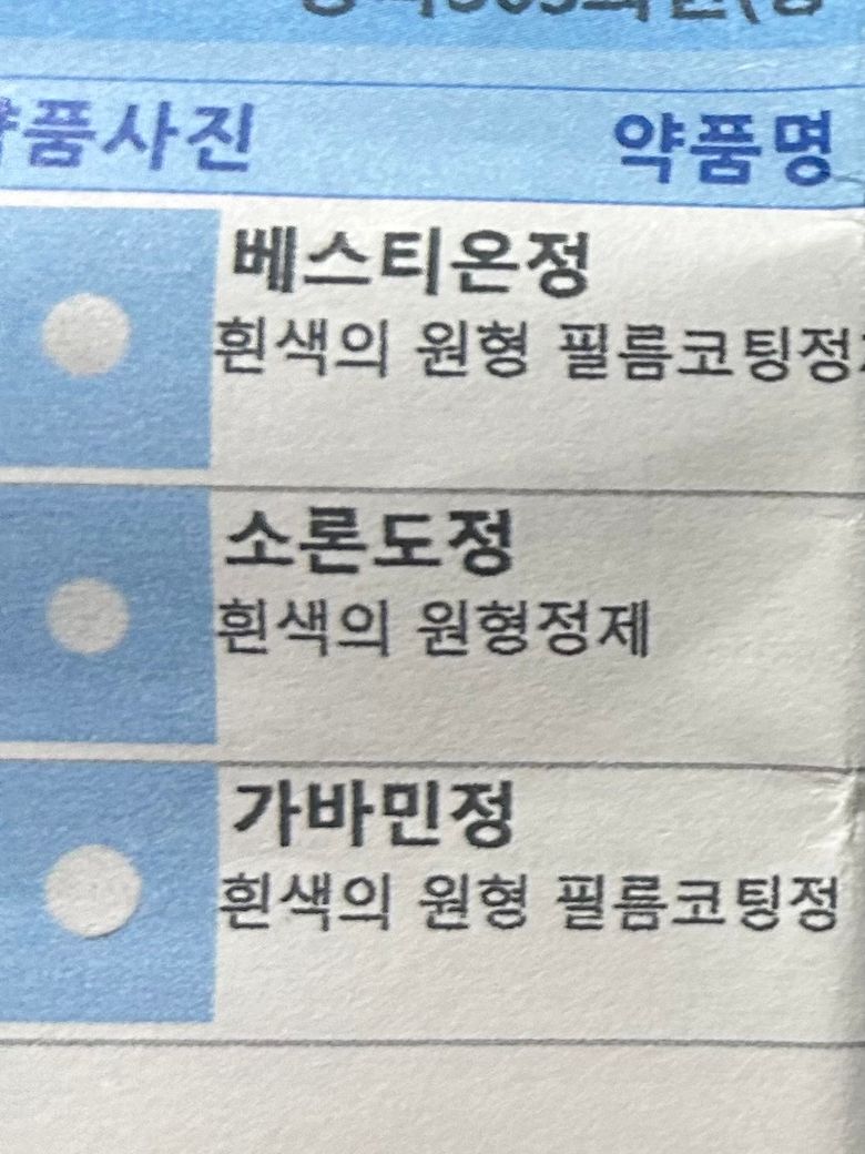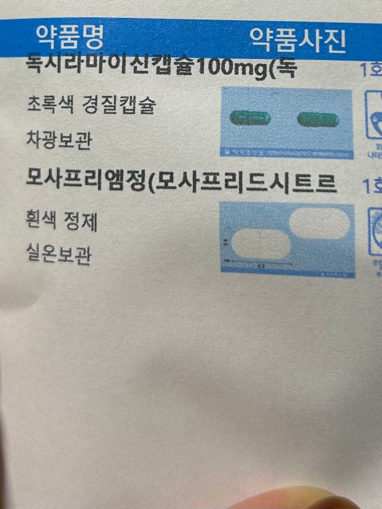 첫번째 사진에 있는 약인 항생제 독시사이클린(Doxycycline) 성분의 '독시라마이신캡슐'과 위장약 모사프리드(Mosapride) 성분의 '모사프리엠정'은 두번째 사진에 있는 약인 항히스타민제 베포타스틴(Bepotastine) 성분의 '베스티온정', 부신피질호르몬제 프레드니솔론(Prednisolone) 성분의 '소론도정' , 위장약 레바미피드(Rebamipide) 성분의 '가바민정'과 특별히 주의해야할 상호작용이 없습니다. 따라서 병용하셔도 괜찮습니다.