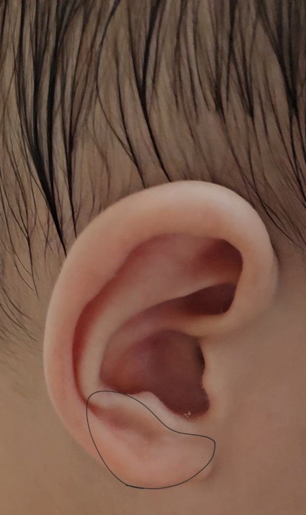 사진에 동그라미된 부분이 사진처럼 울퉁불퉁한 형태는 피부가 연골주변을 감싸면서 생기는 형태로 정상적인 귀모양이기에 걱정하지 않으셔도 됩니다.