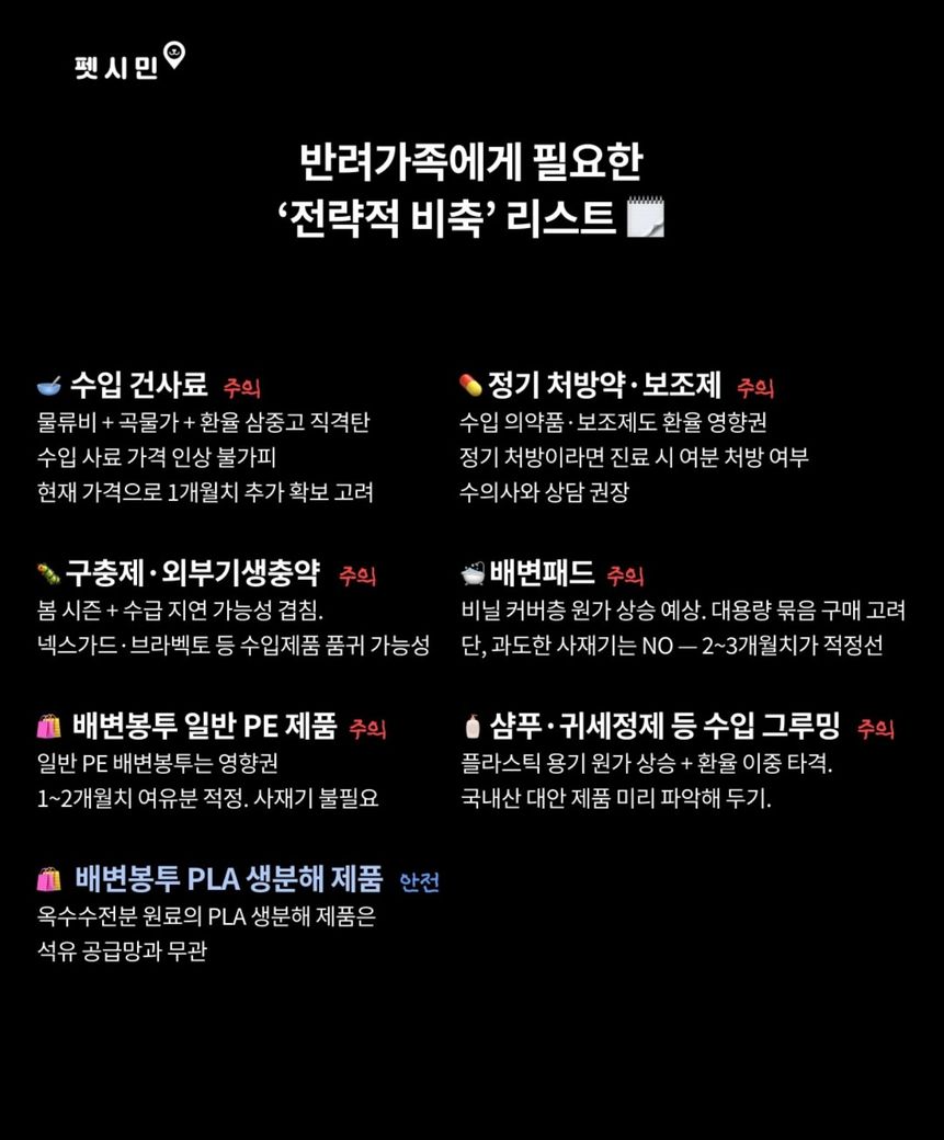 수입 제품은 환율, 운송비, 원자재 가격에 영향을 받기 때문에 가격이 서서히 오를 가능성은 있습니다. 특히 사료, 간식, 배변봉투처럼 석유 원료가 일부 들어가는 제품들은 영향을 받을 수 있습니다. 반면 국산 제품은 상대적으로 영향이 적을 수 있지만, 완전히 자유로운 것은 아니고 일부 원재료를 수입에 의존하기 때문에 일정 부분 변동은 있을 수 있습니다.